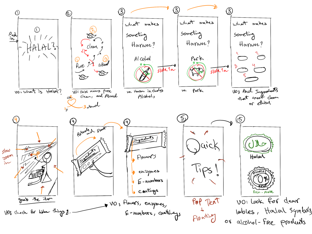 I created hand-drawn storyboards to plan the visual flow of the PSA. Each slide was designed to communicate one idea at a time, such as defining halal, showing what is haram, and giving quick label-reading tips. This helped keep the pacing clear and easy to follow.