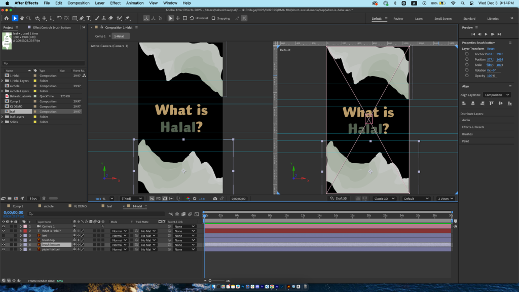 I built the animation in Adobe After Effects by importing assets gradually and organizing them using pre-compositions. I animated text using typewriter effects, scaling, fades, and opacity changes to guide attention. I used color intentionally, such as red for “haram,” to emphasize key points. More advanced techniques like track mattes, parent linking, trim paths, and effects such as Turbulent Displace were used to create smooth transitions and visual interest.